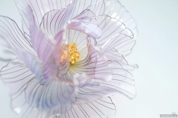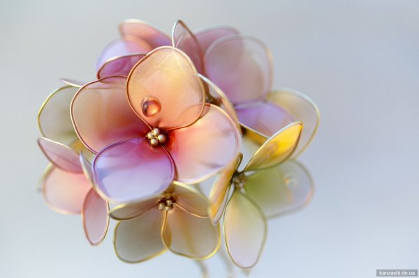 В руках Сакае ювелирная проволока и синтетическая смола превращаются в красивое украшение. Она изгибает контур, заливает тонким слоем смолы. Еще в пластичном состоянии Сакае поднимает лепестки и придает им форму. Затем собирает цветок, облагораживает.