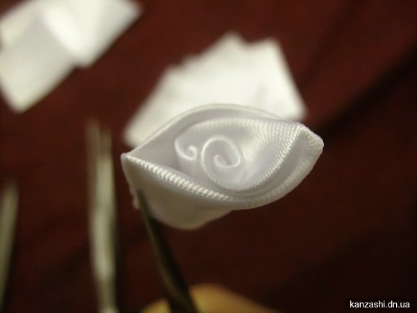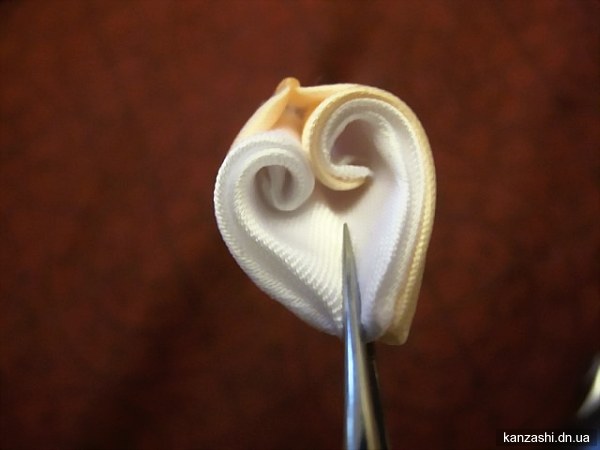 | Спиральку, которую уже сделали, зажимаем пинцетом и придерживаем. Другой уголок тоже скручиваем. Потом придерживаем обе спиральки и складываем, как острый лепесток канзаши. Угол обрезаем. | |